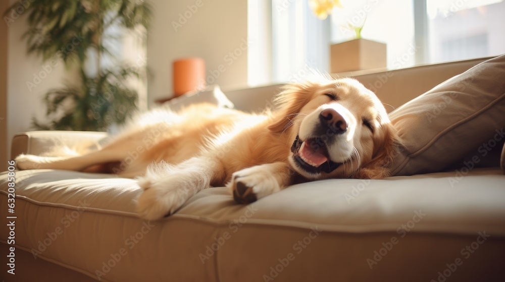 Fototapeta na wymiar - happy golden retriever dog is lying on a cozy sofa in a modern living room.