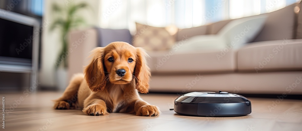 Fototapeta na wymiar - Smart vacuum cleaner for pets with a golden cocker spaniel puppy nearby with copyspace for text.