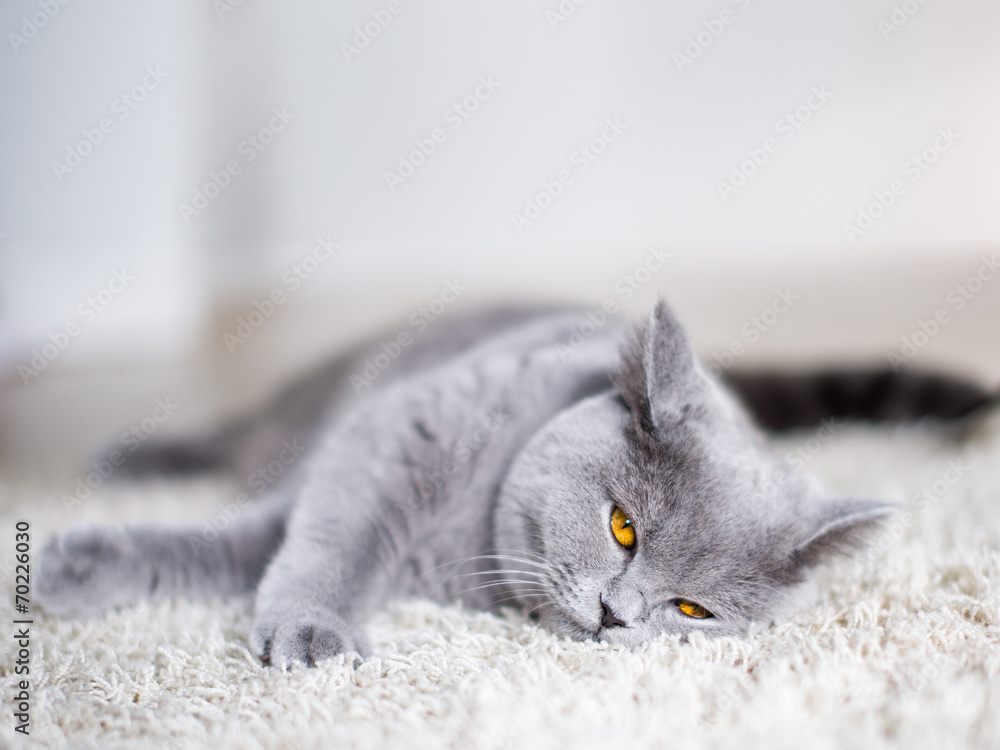 Fototapeta na wymiar - Grey cat laying on the floor.