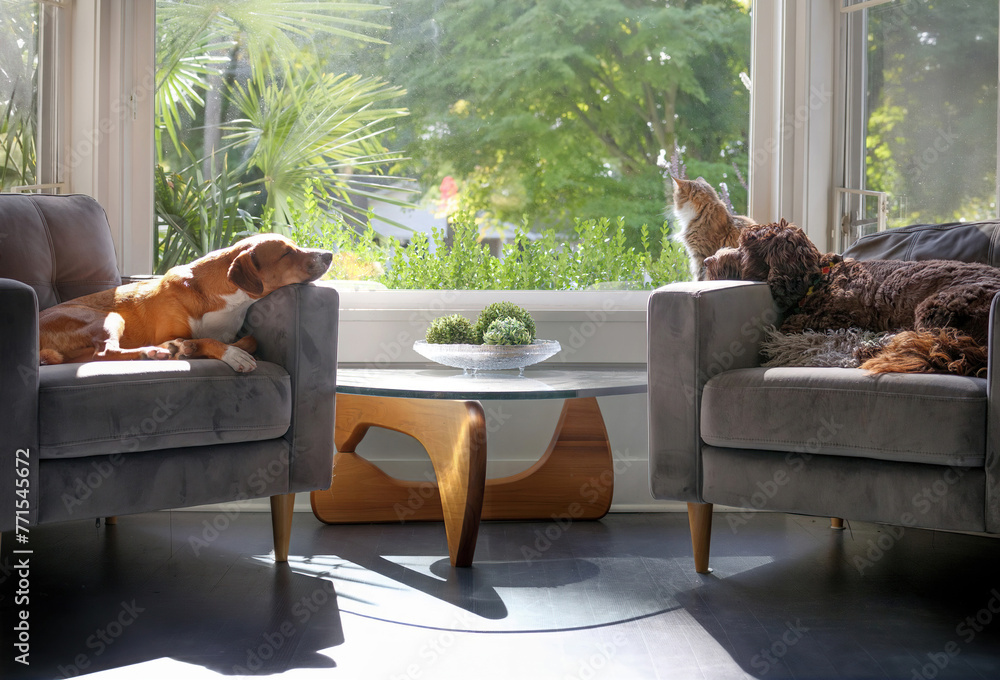 Fototapeta na wymiar - Relaxed dogs and cat in front window in sunny living room. Idyllic group of pets coexisting in multi-pet household. Two dogs sleeping on chairs with cat sitting on window sill. Selective focus..