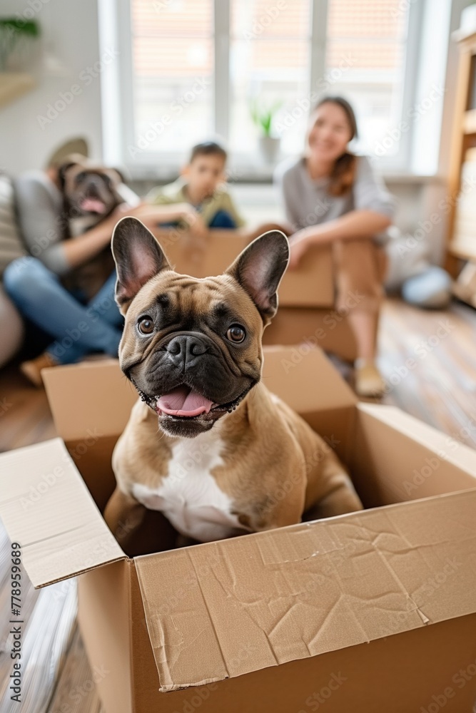 Fototapeta na wymiar - Family with kids and pets moving to new home, cute dog sitting in cardboard box .