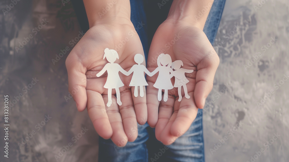 Fototapeta na wymiar - Womans Hands Holding Paper Cut Outs of a Family.