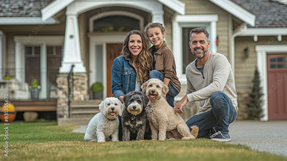 Fototapeta na wymiar - Happy Family with Dogs Posing in Front of House.