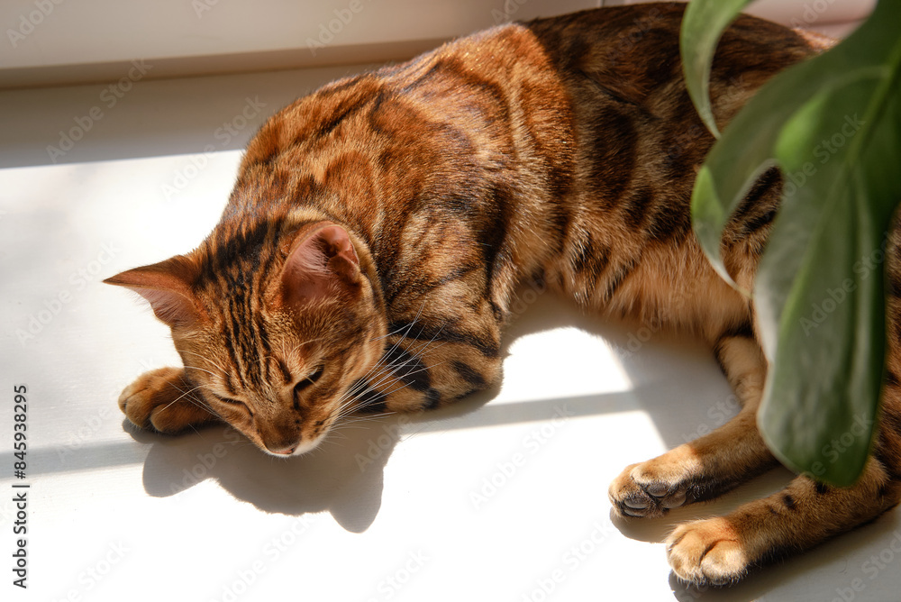 Fototapeta na wymiar - Bengal Cat Bengal cat with striking markings relaxes in a sunbeam on the floor, near a green plant.