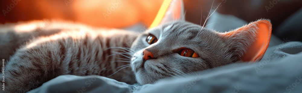 Fototapeta na wymiar - 3D rendering of a beautiful gray and white cat resting at home showcasing the concept of pets with a close up of its eyes.