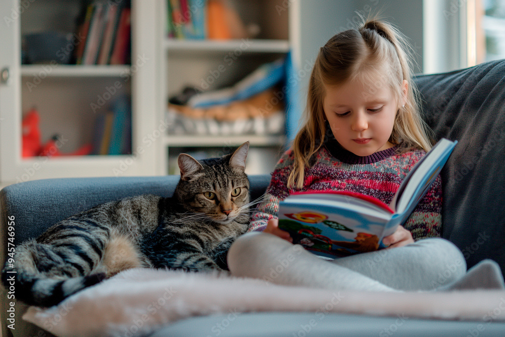 Fototapeta na wymiar - little girl reading a book next to her cat on the couch.