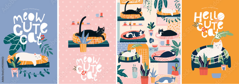 Fototapeta na wymiar - Meow. Cute cats. Vector illustrations of domestic pets kittens on a bed in the interior of a cozy living room with plants for a poster, postcard, logo or background.