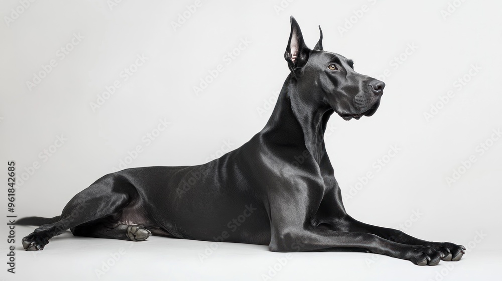 Fototapeta na wymiar - A sleek black Great Dane lying gracefully on a neutral background..