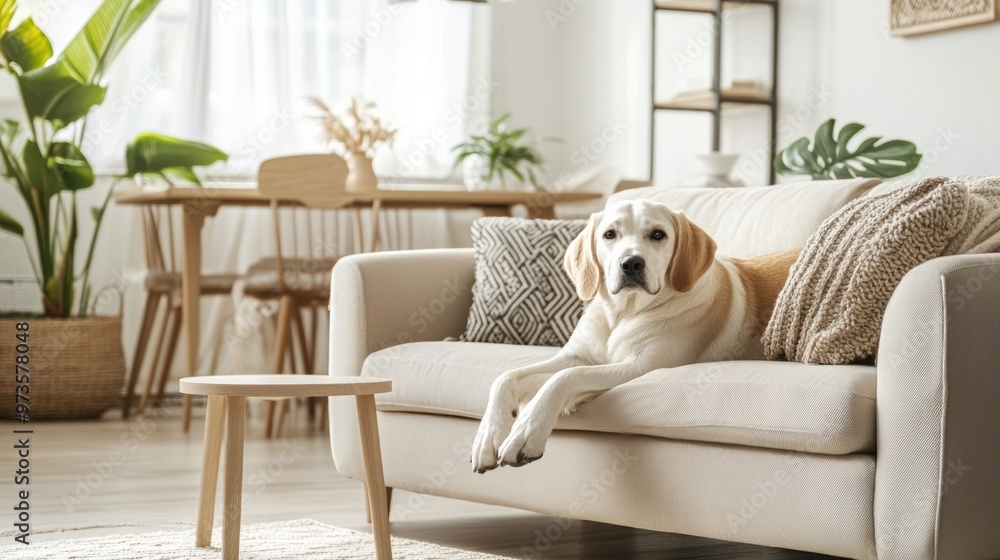 Fototapeta na wymiar - A white dog is relaxing on a beige sofa in a modern living room..