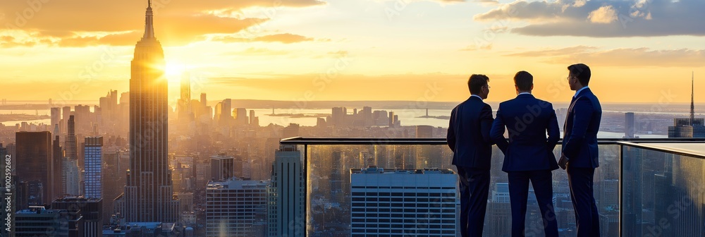 >Fototapety na wymiar>Three men in suits are standing on a balcony overlooking the city. The sun is setting, casting a warm glow over the skyline. The men are looking out over the city, taking in the view