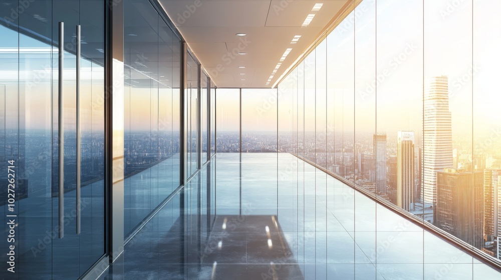 Fototapeta na wymiar - Modern office hallway with large windows overlooking a city skyline at sunset..
