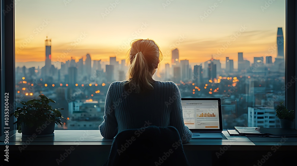 >Fototapety na wymiar>A woman sits at a desk in front of a large window, working on a laptop. The window looks out over a city skyline, with the sun rising in the background. The city is lit up with the morning light.