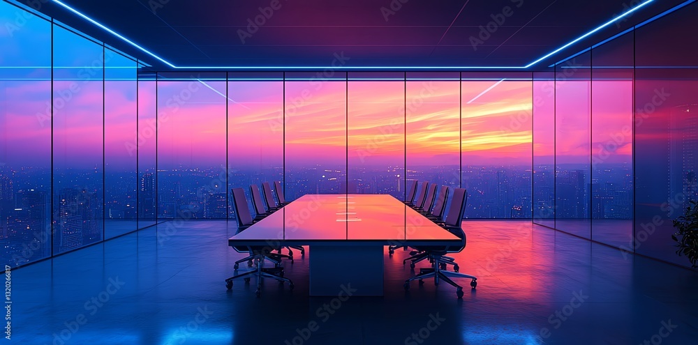 Fototapeta na wymiar - Modern Conference Room with Sunset City View Through Panoramic Windows.