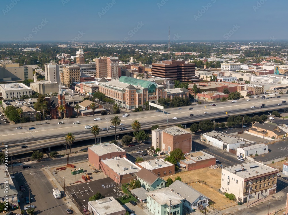 >Fototapety na wymiar>Aerial view of Stockton, California, USA, showcasing the city's architecture, including office buildings, a church, and a shopping mall, alongside a busy highway with cars.