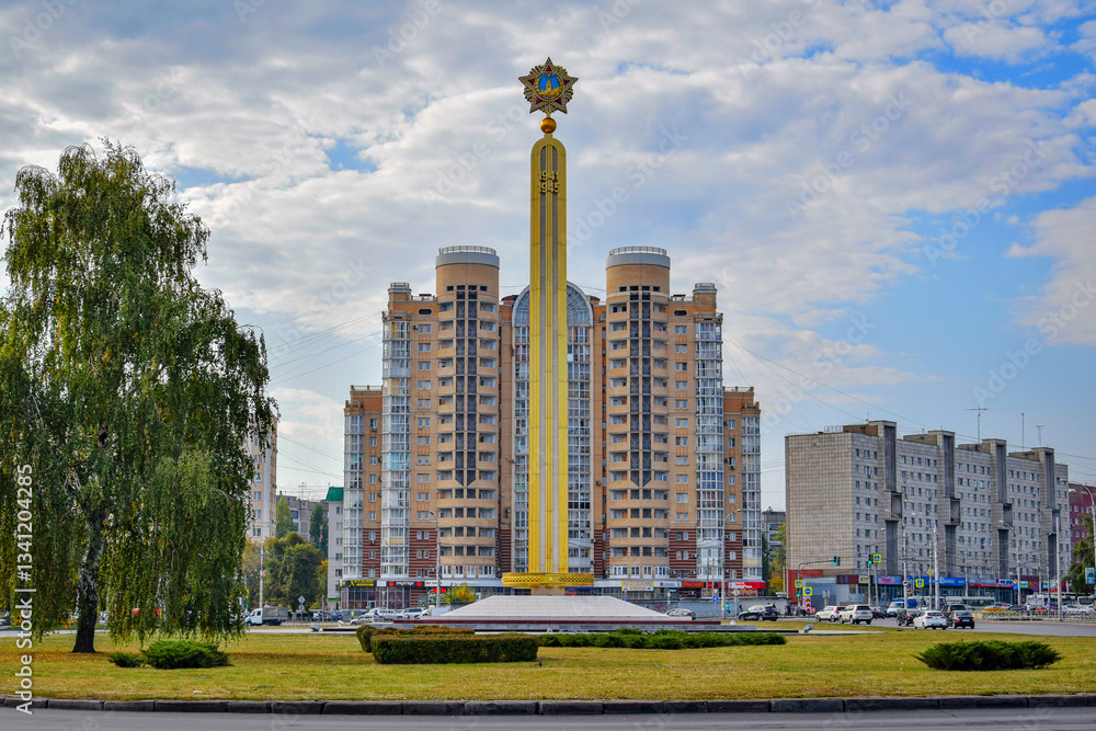 Fototapeta na wymiar - Victory Square with stele and residential buildings in Lipetsk.