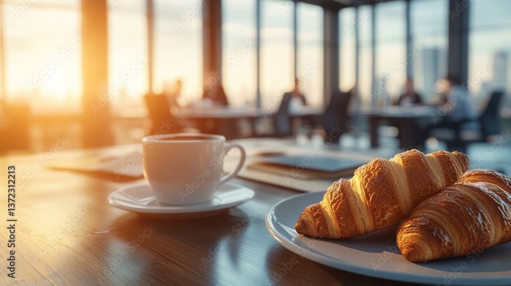 Fototapeta na wymiar - Coffee with croissants on a table with people meeting in background and city view.