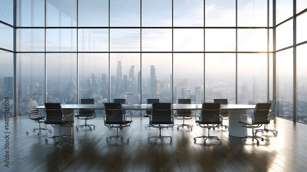 Fototapeta na wymiar - Elegant corporate meeting room with a large conference table, chairs, and a panoramic city view through expansive windows..