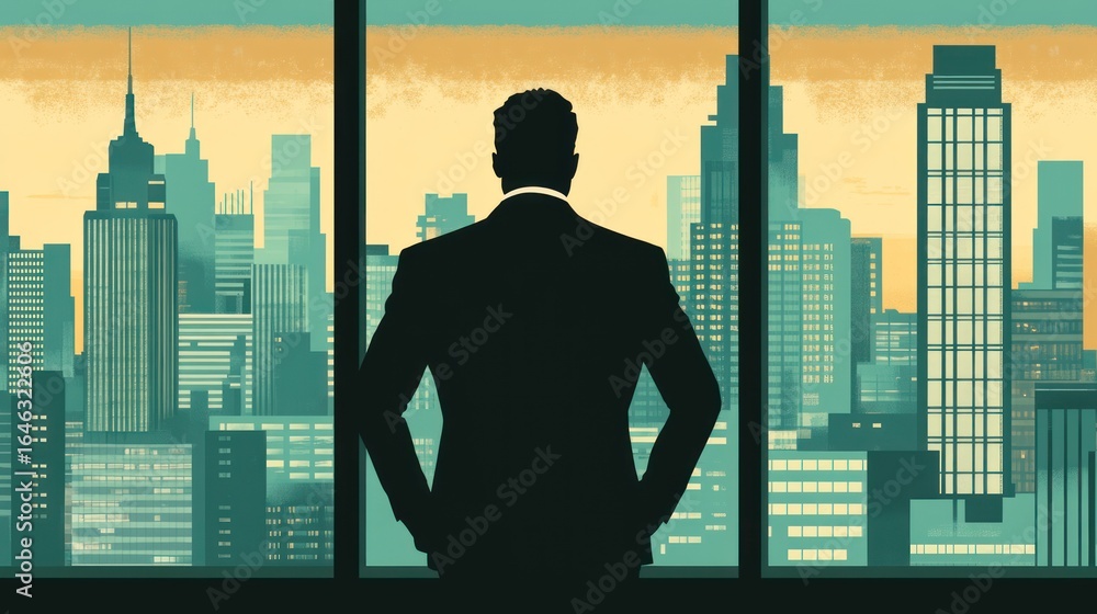 Fototapeta na wymiar - Businessman views cityscape from window.