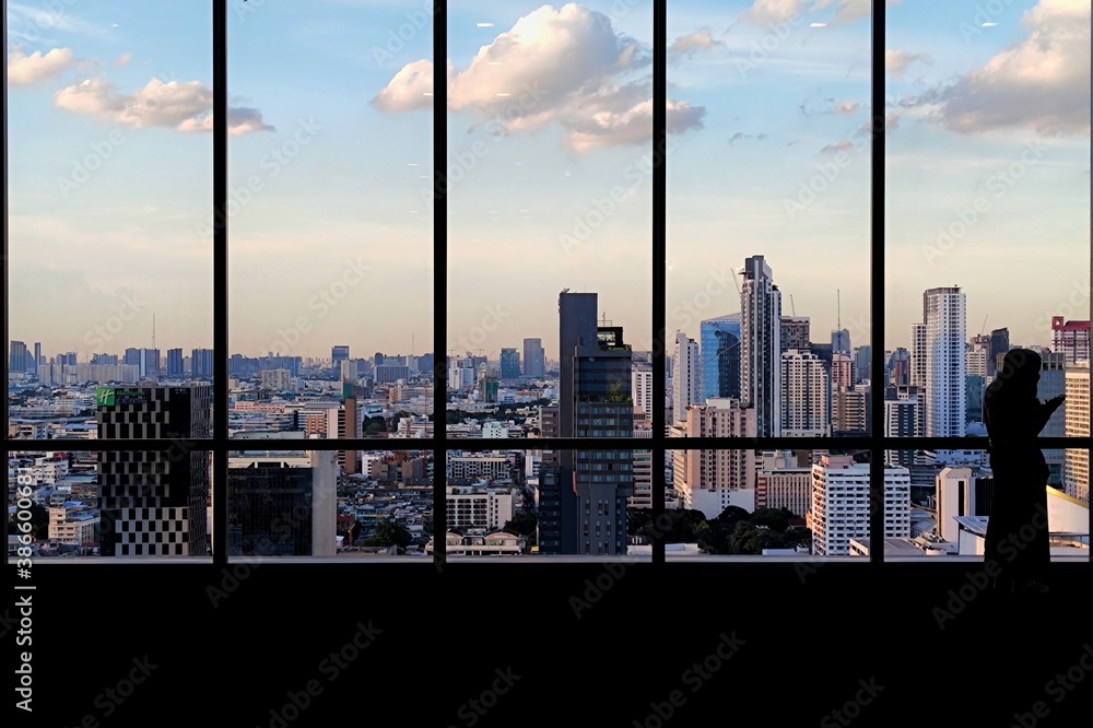 Fototapeta na wymiar - silhouette outline of women tourist taking pictures of city skyline from an observatory. sunset at modern urban business district. steel frame rose windows architectural element design..