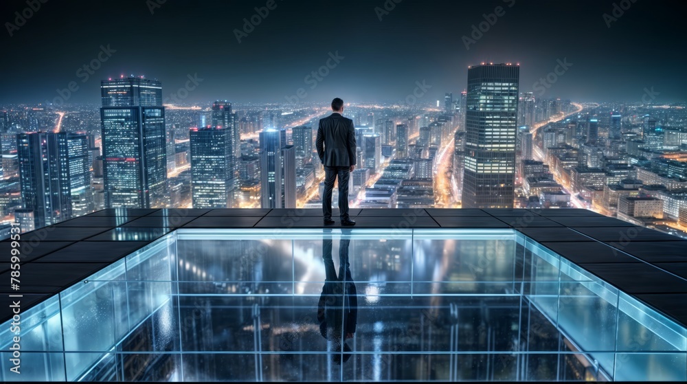 Fototapeta na wymiar - Rear view of businessman standing on rooftop and looking at night city.