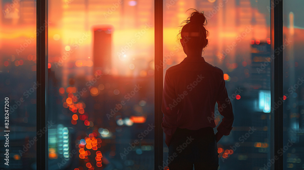 Fototapeta na wymiar - Ambitious woman standing in an office with a city view, representing success and determination.