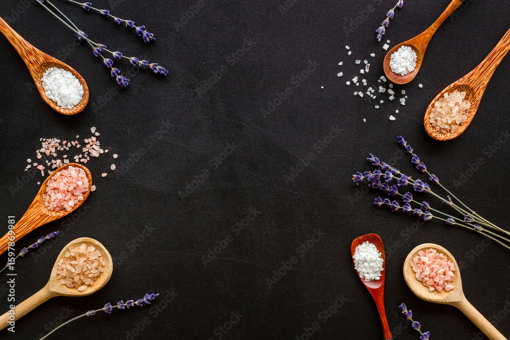 Fototapeta na wymiar - Beauty spa therapy cosmetics and wellness flat lay - sea salt in many spoons with flowers, top view.