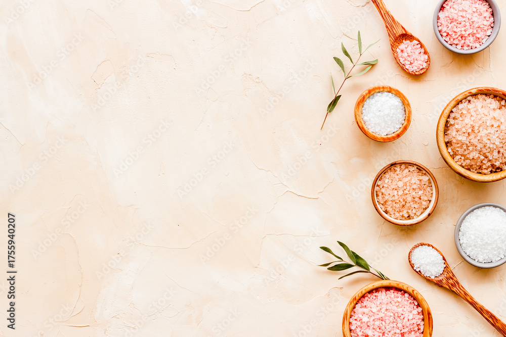 Fototapeta na wymiar - Beauty spa therapy cosmetics and wellness flat lay - sea salt in many bowls with flowers, top view.
