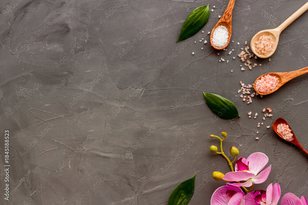 Fototapeta na wymiar - Beauty spa therapy cosmetics and wellness flat lay - sea salt in many spoons with flowers, top view.