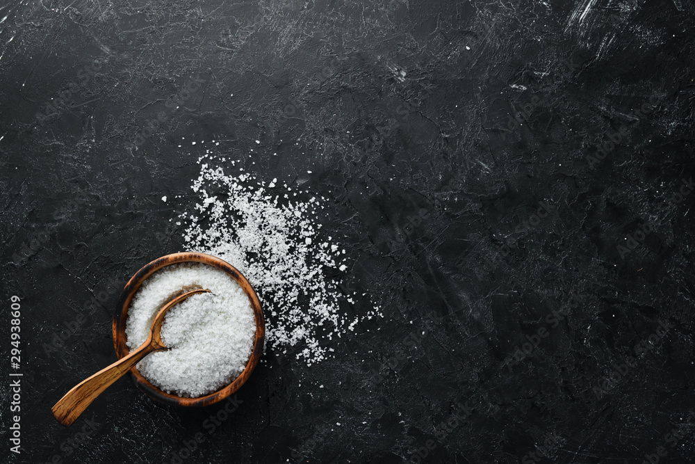 Fototapeta na wymiar - Salt in a wooden spoon. Sea salt. On a black stone background. Spa treatments. Top view. Free space for your text..