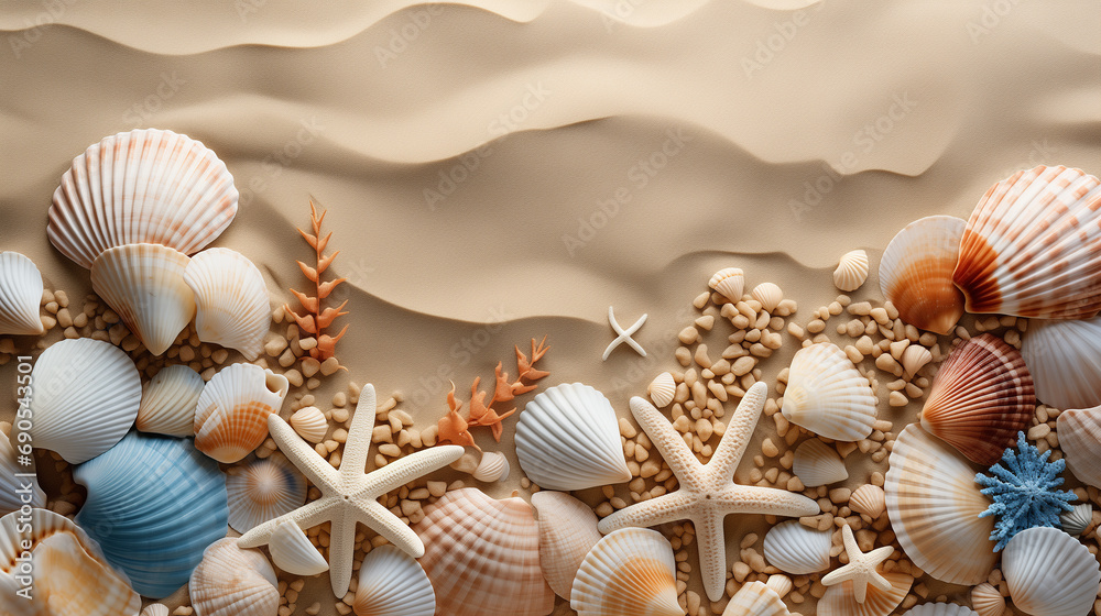 Fototapeta na wymiar - Seabed with different seashells and sea stars, top view.