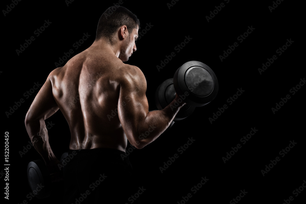 Fototapeta na wymiar - Athletic man training biceps on black background.