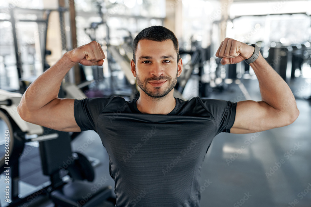 >Fototapety na wymiar>Young athletic man proudly flexing both arms to show muscular biceps in modern fitness club. Concept of confidence, strength, fitness progress, and healthy lifestyle.