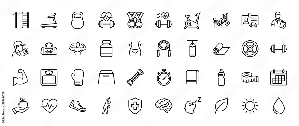 >Fototapety na wymiar>Fitness and healthy lifestyle line icon set. Vector pictograms of gym equipment, sport training, and health care symbols, thin outline illustration.