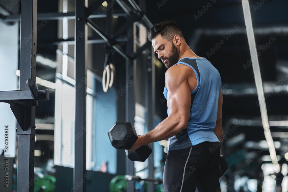 Fototapeta na wymiar - Handsome athlete training arms with dumbbells at gym.