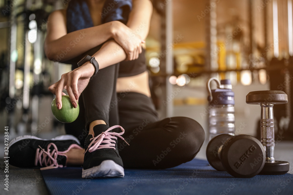 Fototapeta na wymiar - Woman sitting holding an apple after a workout in the gym at sunset. fitness ,workout, gym exercise ,lifestyle and healthy concept..