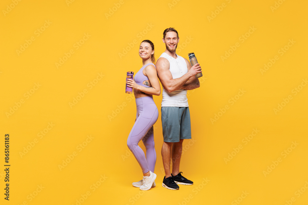 Fototapeta na wymiar - Full body side view young strong fitness trainer sporty two man woman wear blue clothes spend time in home gym hold bottle drink water isolated on plain yellow background. Workout sport fit concept..