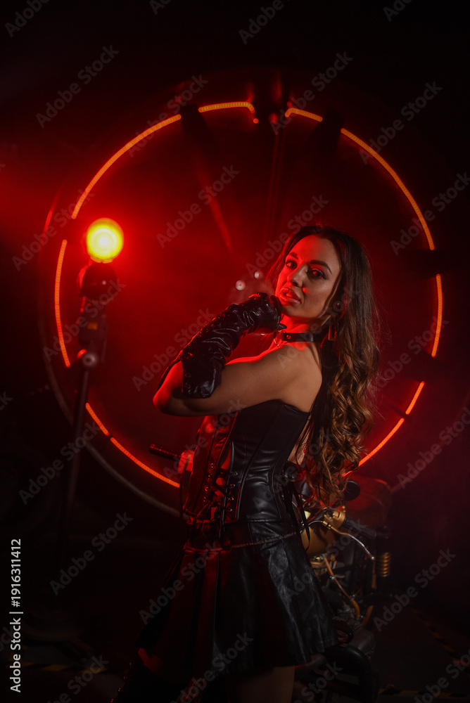 Fototapeta na wymiar - Stylish beautiful young woman in black leather corset and boots posing on vintage motorcycle on old garage dark interior background..