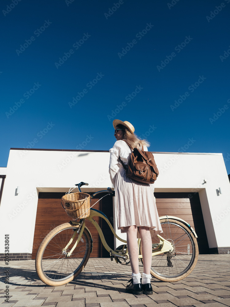 Fototapeta na wymiar - Pretty girl in hat and dress by cruiser bicycle in suburb.