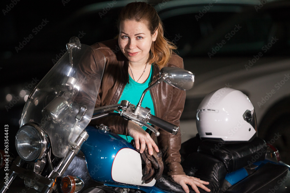 Fototapeta na wymiar - Biker girl portrait, young heavily-built woman standing near her motorcycle and white helmet in dark parking.