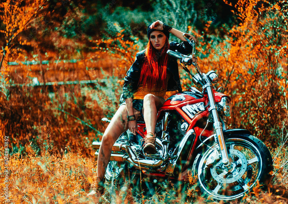 Fototapeta na wymiar - red-haired beautiful girl and motorcycle outdoors.