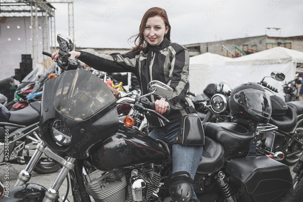 Fototapeta na wymiar - A sexy young red-haired woman with a red manicure is seductively writhing on a motorcycle. Sexy young woman on a motorcycle..