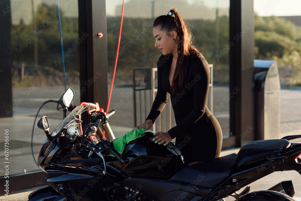 Fototapeta na wymiar - close up of seductive young woman's hand washing stylish sport motorcycle and wipes it from pink foam at sunrise..