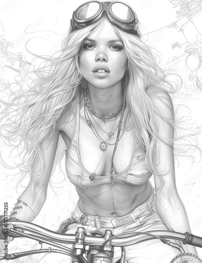Fototapeta na wymiar - Biker on a motorcycle. Traveling through future cities. A girl on a motorcycle wearing a helmet. Illustration for coloring book.