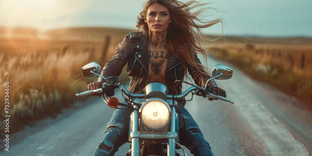 Fototapeta na wymiar - A Beautiful woman biker wearing glass with tattoos muscled arms and legs, long hair in the wind, high heel boots, leather jacket, riding a motorcycle.