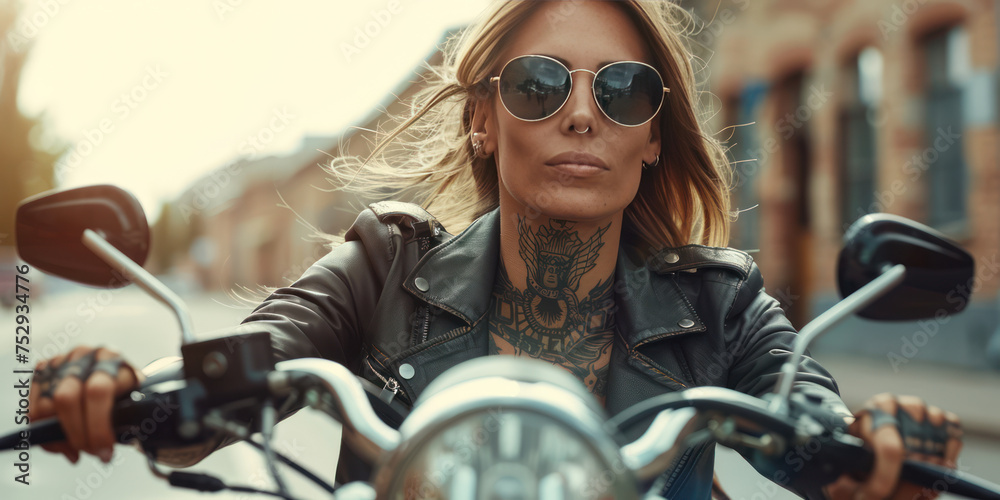 Fototapeta na wymiar - A Beautiful woman biker wearing glass with tattoos muscled arms and legs, long hair in the wind, high heel boots, leather jacket, riding a motorcycle.
