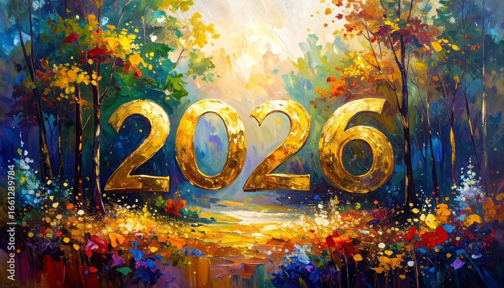 Fototapeta na wymiar - Napis 2026 na obrazie olejnym. Tło noworoczne.