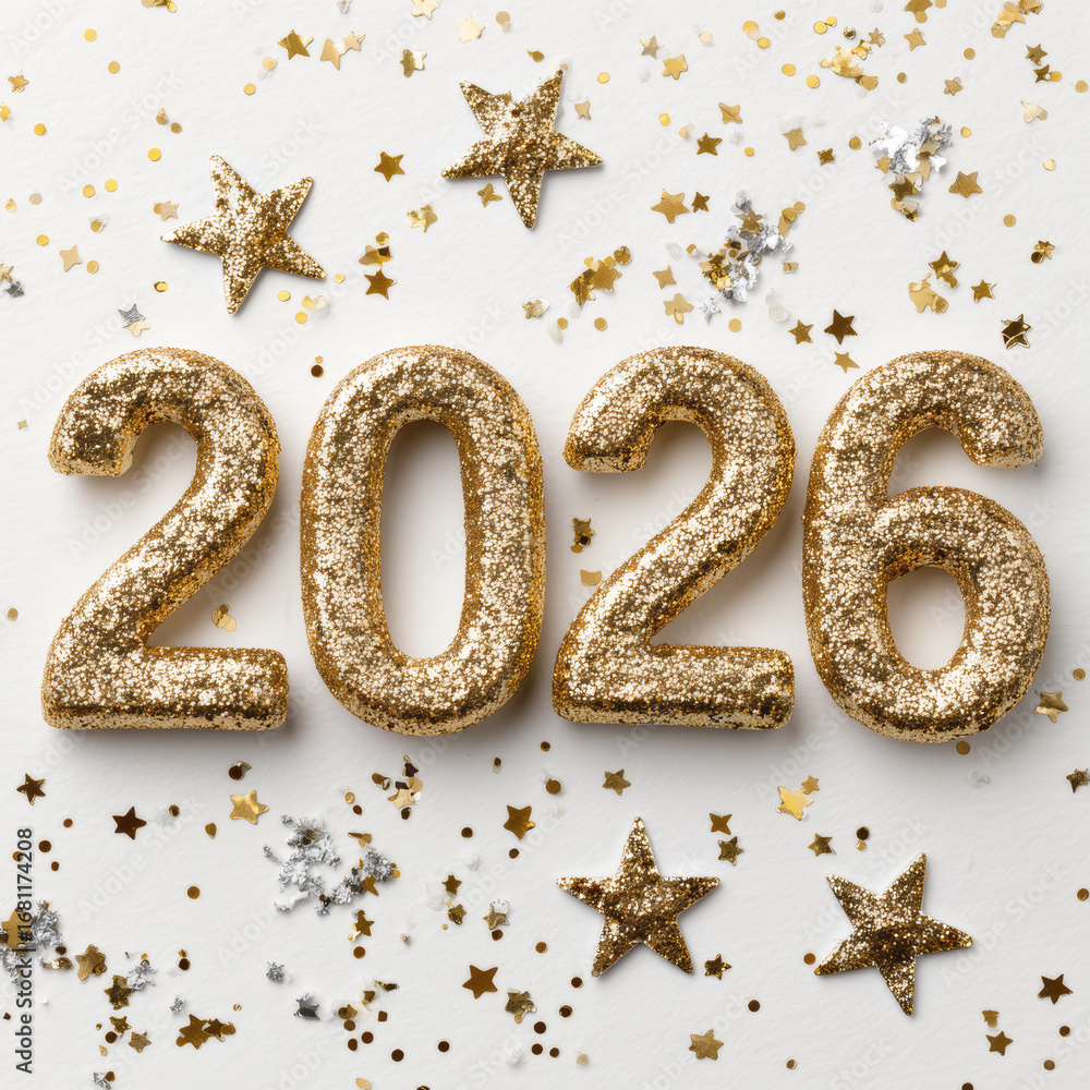 Fototapeta na wymiar - 2026 w złotych cyfrach na białym tle z konfetti – elegancka noworoczna dekoracja.
