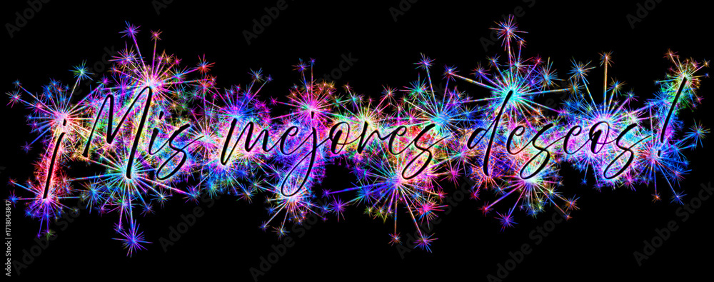 Fototapeta na wymiar - Kolorowe zimne ognie i fajerwerki układające się w kształt życzenia ALL THE BEST w języku hiszpańskim..