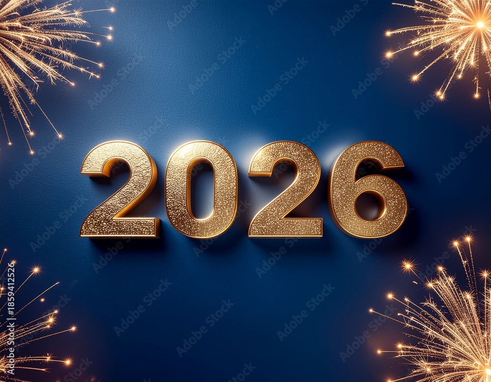Fototapeta na wymiar - Sylwestrowe tło ze złotym napisem 2026 i fajerwerkami na niebieskim tle.
