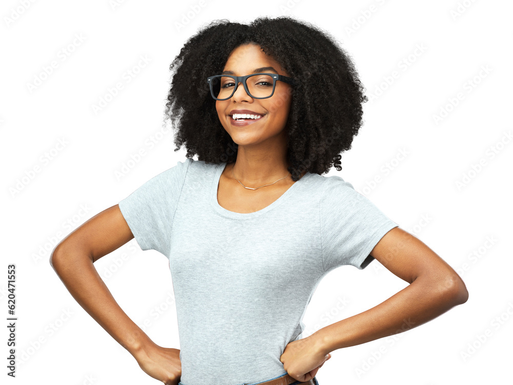 >Fototapety na wymiar>Portrait, smile and black woman with glasses, confidence and fashion isolated on a transparent png background. Face, nerd and happiness of African female model from Nigeria, hands on hips and style